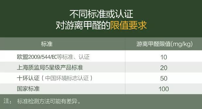 欧盟 2009/544/EC指令、德国蓝天使认证、美国EPA、CARB等标准或认证,甚至将游离甲醛的含量提高到了10mg/kg限值,是国标的1/10。