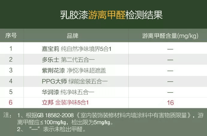 结果显示,立邦检出甲醛,其余6款均未检出。