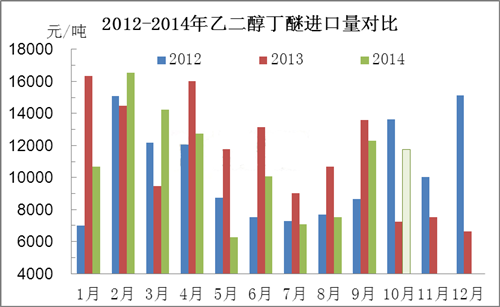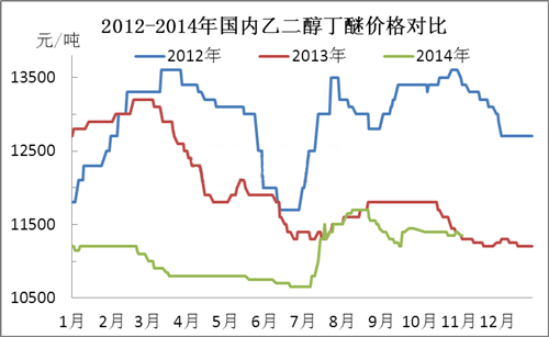 图1为2012-2014年国内乙二醇丁醚华东市场价格走势对比。近3年来,国内市场价格震荡起伏,但不难发现,年末、年初及年中阶段,乙二醇丁醚市场价格进入谷底,清明节后及传统旺季期间(金九银十),市场将迎来反弹狂潮。然2014年市场一反常态,上半年,市场供需矛盾凸显,价格持续走软,直至下半年,因国内外装置检修,社会库存减缓等利好提振下,市场小幅反弹,然反弹力度有限,与去年价格相比暂无较大差异,然与2012年同期相比,价差均在1000元/吨以上,惨不忍睹。年末,市场需求转淡,供应压力凸显,厂商量价不能两全,市场低价探市者频现,因此小编认为今年市场也不能逃脱跌价的魔咒,然全年来看企业盈利微薄,企业运营压力不减,大幅降价的可能性不大,跌幅控制在100-200元/吨附近,僵持运行为主。