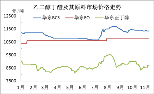 今年以来,双原料环氧乙烷、正丁醇价格震荡运行。由图2可知,乙二醇丁醚价格走势与正丁醇价格波动较为相近,说明正丁醇对乙二醇丁醚价格影响较大。近期油价暴跌,部分化工产品随之下行,然正丁醇因部分厂商装置停车,社会整体供应能力偏低,因此油价狂跌时,市场并没有紧跟跌势,11月份因装置检修等利好提振,价格呈上行趋势。另一原料环氧乙烷,行情持续低迷,跌价传闻释放已久,迟迟不见实际下调迹象,成本支撑下,目前乙二醇丁醚市场暂僵持运行。然多数业者对原料后期持悲观预期,国外生产厂商产销承压,外盘已窄幅下调,后续仍有回调空间,因此年末国内外成本面均显弱势,加剧乙二醇丁醚市场看空气氛。
