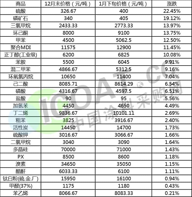 除PTA价格上涨之外,硫酸、三氯甲烷、环乙酮、甲苯、聚合MDI等几十种的材料价格也较2018年末的价格出现了不同程度的上涨, 最高涨价达22.45%。部分化工原材料上涨比例如下:
