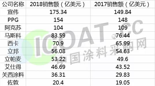 2019年一开年,国外各涂料龙头企业陆续发布2018年度业绩报告。就目前公布的数据来看,2018年宣伟以达到创纪录的175.34亿美元的销售额稳居行业榜首,PPG以154亿美元居于宣伟之下,PPG未来在并购方面或有所才建树,重新夺回全球涂料老大的宝座将是大概率事件。