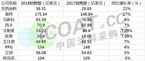 从以上数据来看,较之2017年,增长速度最快的是关西涂料,增速达到22%,其次宣伟的增长速度也不可小觑,增速达到17%。总体来说,以上企业销售额基本上都处于增长状态,目前,仅阿克苏一家企业全年销售额下降5%。