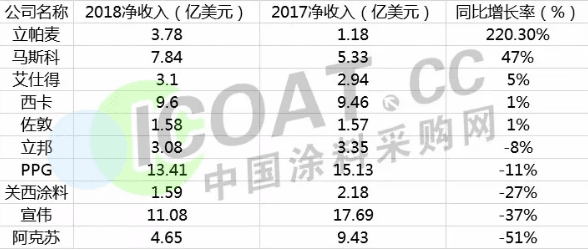 从以上数据可以看出,2018年立帕麦净利润以惊人的速度在增长。但是宣伟、PPG、阿克苏诺贝尔、立邦、关西涂料、佐敦的净利润都出现了不同程度的下滑,其中宣伟的下滑速度达到了37.4%。从各大涂料企业的财报中可以看出,2018年各涂料巨头的营业收入都是出现不同程度的上升,但是净收入却出现了下滑,其下滑的主要原因是原材料价格的上涨所致。