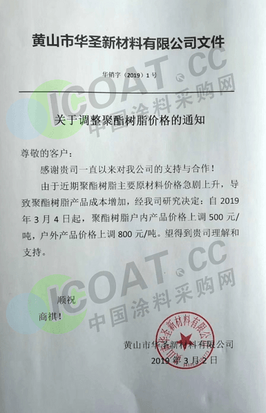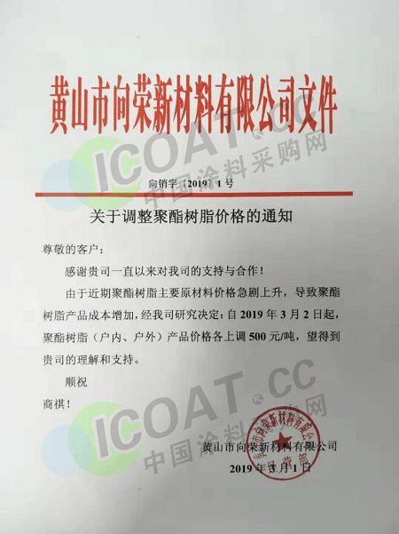 黄山市华圣新材料有限公司发布《关于调整聚酯树脂价格的通知》称,由于近期聚酯树脂主要原材料价格急剧上升,导致聚酯树脂产品成本增加,经黄山华圣新材料研究决定:自2019年3月4日起,聚酯树脂户内产品价格上调500元/吨,户外产品报价上调800元/吨。