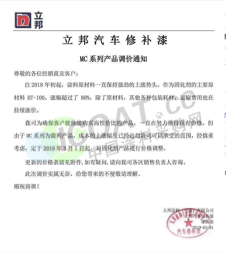 立邦涂料为确保客户能继续购买高性价比的产品,一直努力维持现有价格,但由于MC系列为微利产品,成本的上涨幅度已经远超立邦可以承受的范围,经慎重考虑,定于2019年3月1日起,对固化剂产品进行价格调整。