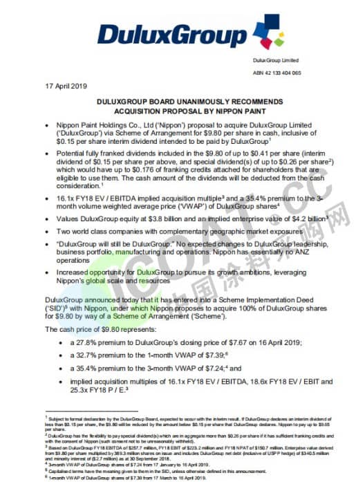 Nippon总裁兼首席执行官Tetsushi Tado先生说:“我们对此次收购感到兴奋,欢迎多乐士集团加入日本集团。 Patrick和他的团队建立了DuluxGroup进入澳大利亚和新西兰的住房改善产品的卓越供应商,澳洲多乐士拥有市场领先和标志性的品牌,拥有世界一流的制造业务设备。多乐士集团和日本的合并将提供更为广阔的市场,也将为DuluxGroup团队和员工以及所有DuluxGroup管理层创造令人兴奋的机会。 Nippon打算保留DuluxGroup名称,促进多乐士集团的现有愿景平台。作为日本集团的一部分,它将照常营业,DuluxGroup仍将是多乐士集团。”