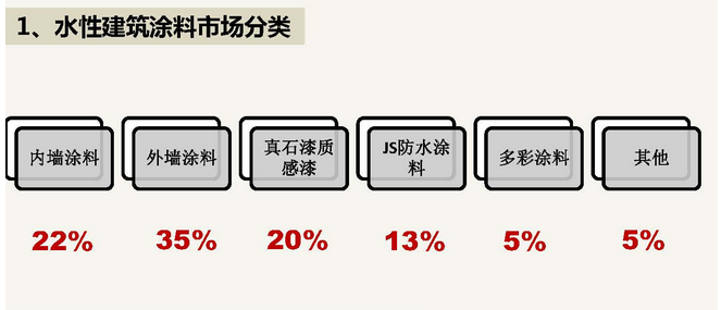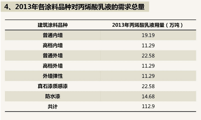 【中国涂料采购网】面对品种繁多的涂料市场,我们若对每种细分产品进行量化,进而推算出涂料对原材料的用量,那么将会对涂料及原材料市场相关业者提供一定的参考依据。我们以成膜物质丙烯酸乳液为例,通过实际调查及市场经验总结,以2013年为例,对水性建筑涂料市场对丙烯酸乳液的需求量进行细化探究。