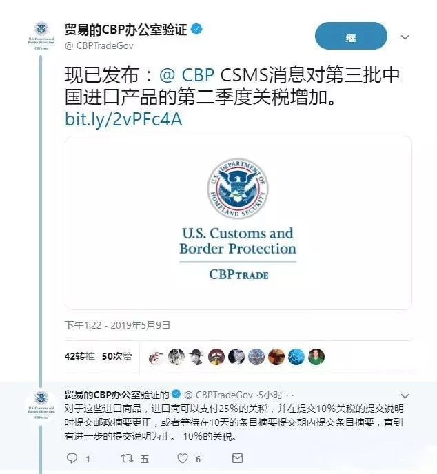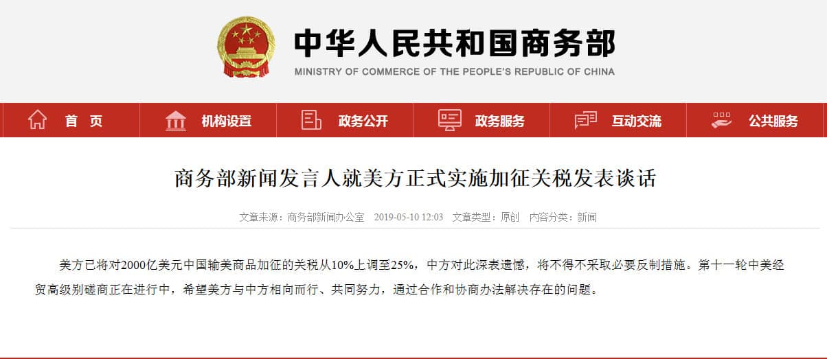而在5月10日,美方对2000亿美元中国输美商品加征的关税从10%升至25%。对于美方此举,中方深表遗憾,并将不得不采取必要反制措施,同时再度重申:加征关税无法解决问题,合作和协商才是正确出路,但必须以尊重彼此核心关切为前提。