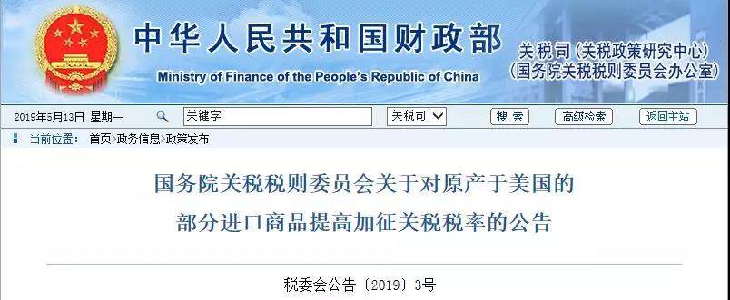 昨日(5月13日),国务院关税税则委员会发布公告决定对原产于美国的部分进口商品提高加征关税税率的公告称,根据《中华人民共和国对外贸易法》《中华人民共和国进出口关税条例》等法律法规和国际法基本原则,经党中央、国务院批准,国务院关税税则委员会决定,自2019年6月1日0时起,对《国务院关税税则委员会关于对原产于美国约600亿美元进口商品实施加征关税的公告》(税委会公告〔2018〕8号)中部分商品,提高加征关税税率,按照《国务院关税税则委员会关于对原产于美国的部分进口商品(第二批)加征关税的公告》(税委会公告〔2018〕6号)公告的税率实施。即:2493个税目商品,实施加征25%的关税;1078个税目商品,实施加征20%的关税;对974个税目商品,实施加征10%的关税。对595个税目商品,仍实施加征5%的关税。
