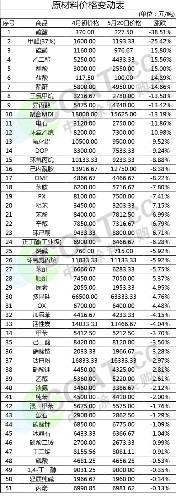 根据以上表格可以看出,4月初至5月20日期间,50多种原材料价格处于下降趋势。降幅最大的是硫酸,降幅高达38.51%,甲醛(37%)降幅为25.42%,硫磺降幅为15.8%,其余的原材料价格也呈现了小幅度下滑趋势。对比涂料采购网报道的4月原材料价格持续走高,涨幅高达77.5%来看,近期原材料已经走出了涨价神坛。据业内人士分析,上游原材料价格下跌,主要原因是涂料企业需求疲软造成的。