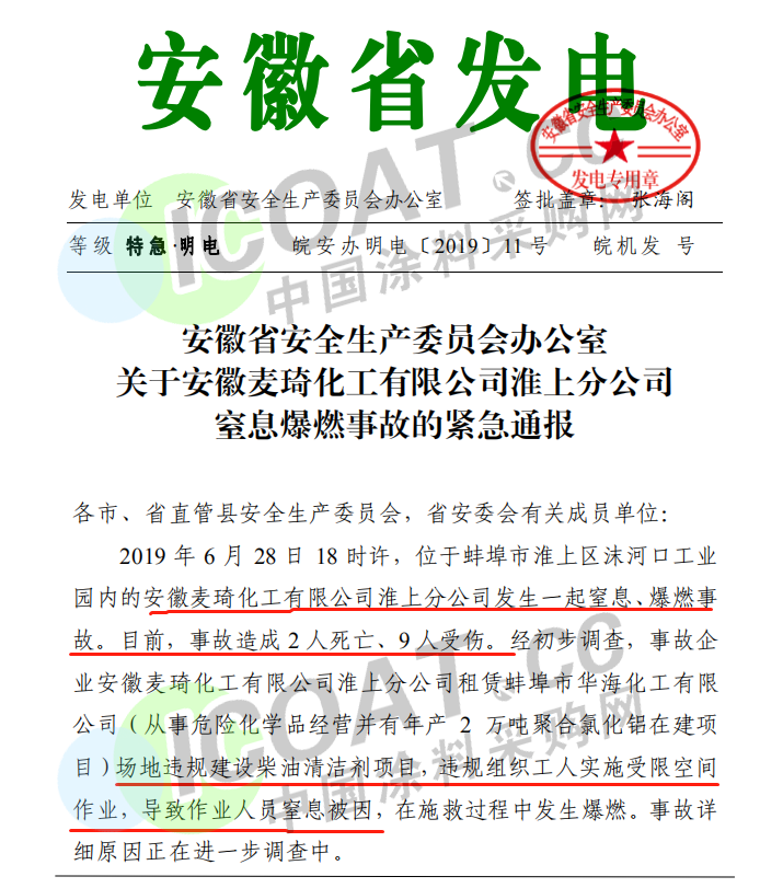 经初步调查,事故企业安徽麦琦化工有限公司淮上分公司租赁蚌埠市华海化工有限公司(从事危险化学品经营并有年产2万吨聚合氯化铝在建项目)场地违规建设柴油清洁剂项目,违规组织工人实施受限空间作业,导致作业人员窒息被因,在施救过程中发生爆燃。事故详细原因正在进一步调查中。