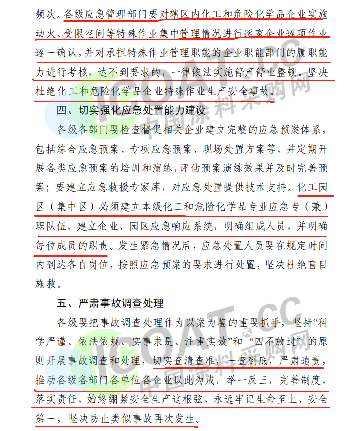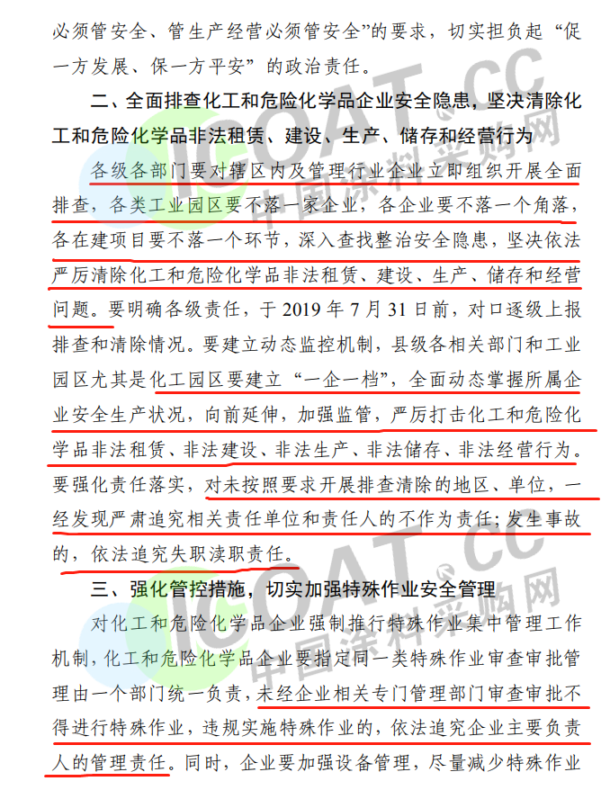 各级各部门要对辖区内及管理行业企业立即组织开展全面排查,各类工业园区要不落一家企业,各企业要不落一个角落,各在建项目要不落一个环节,深入查找整治安全隐患,坚决依法严厉清除化工和危险化学品非法租赁、建设、生产、储存和经营问题。