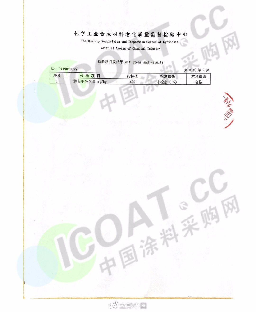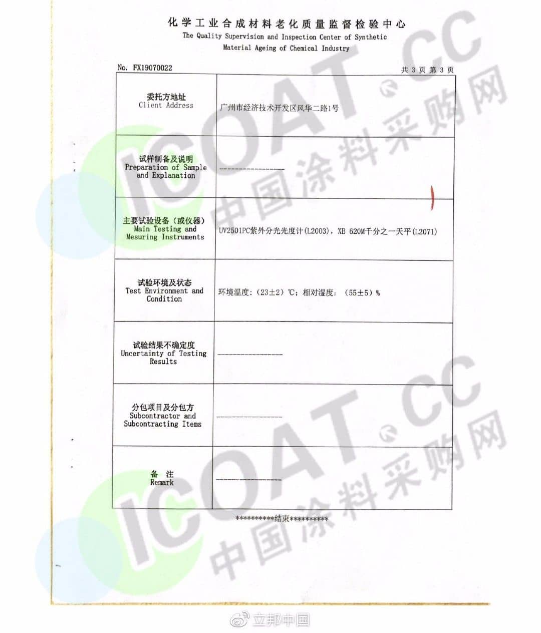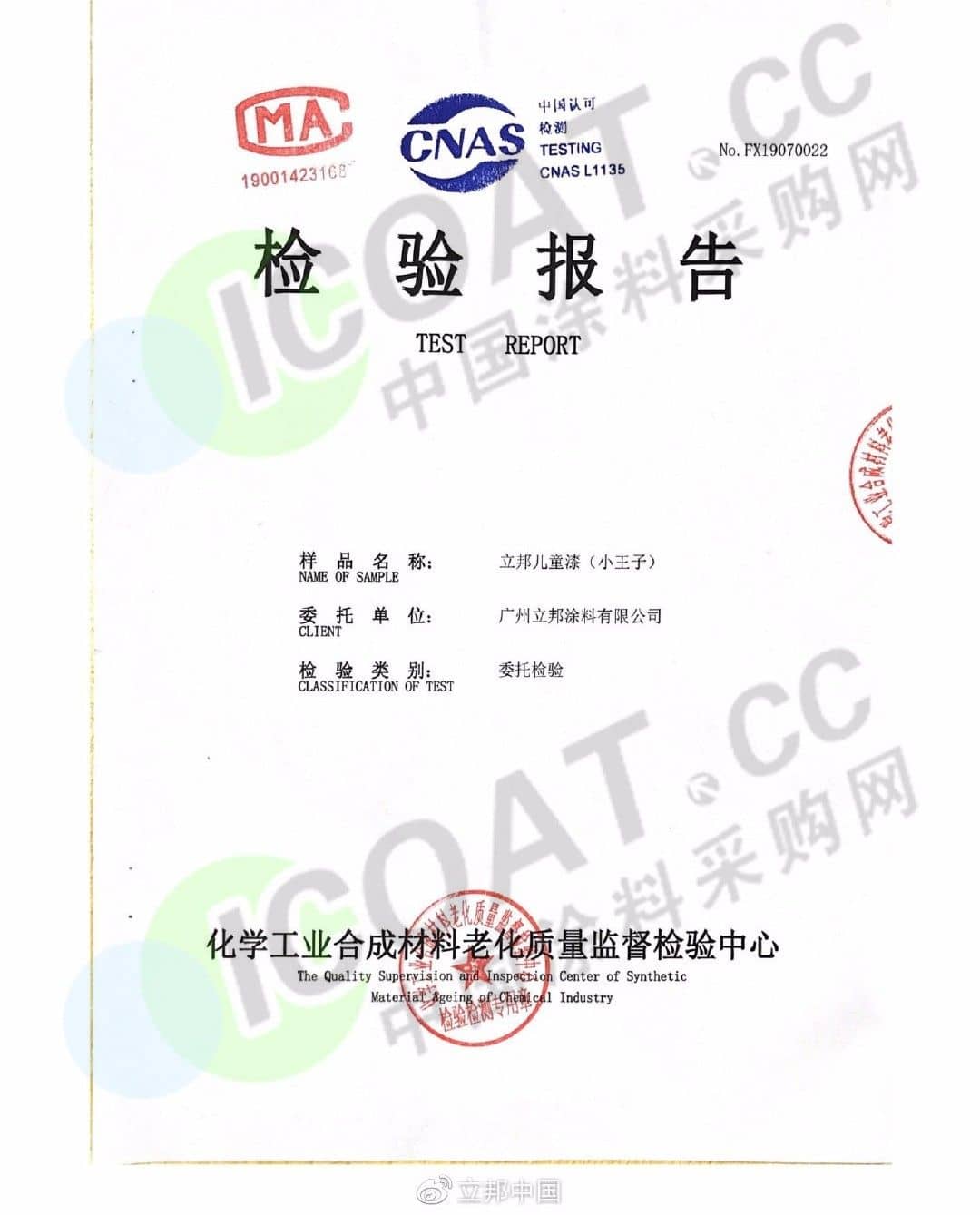 出于对社会负责、对消费者负责的目的,7月4日,广州立邦涂料有限公司委托具有国家评定检验资质的第三方机构“化学工业合成材料老化质量监督检验中心”,送检立邦儿童漆(小王子),生产日期:2019年5月23日,生产批号:1904252D58,根据GB/T 34676-2017儿童房装饰用内墙涂料为检验依据,对“有害物质限量要求”进行检验,检验结果:未检出(<5)。