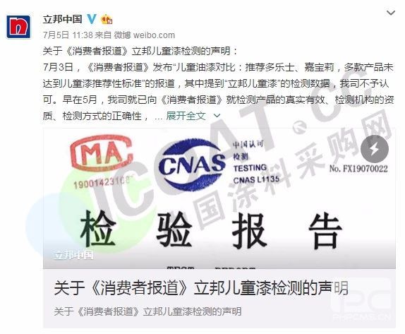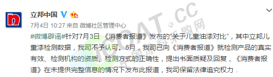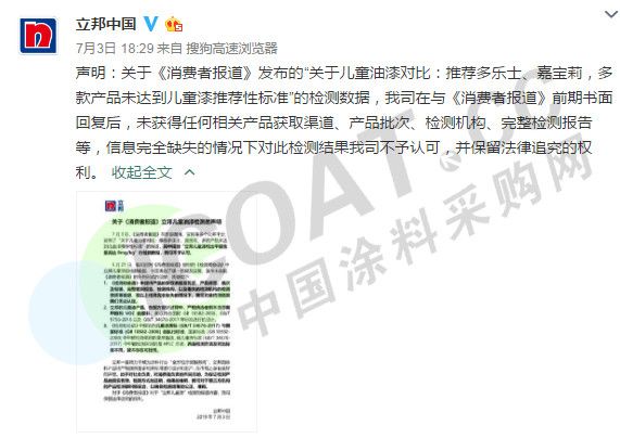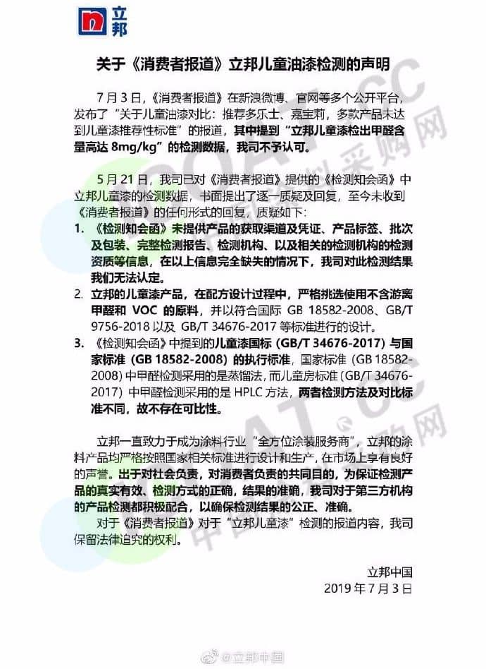 7月3日,《消费者报道》发布“儿童油漆对比:推荐多乐士、嘉宝莉,多款产品未达到儿童漆推荐性标准”的报道,其中提到“立邦儿童漆”的检测数据,我司不予认可。早在5月,我司就已向《消费者报道》就检测产品的真实有效、检测机构的资质、检测方式的正确性,提出书面质疑及回复,《消费者报道》未就我司的回复,提供任何可保证本次检测真实有效的信息。