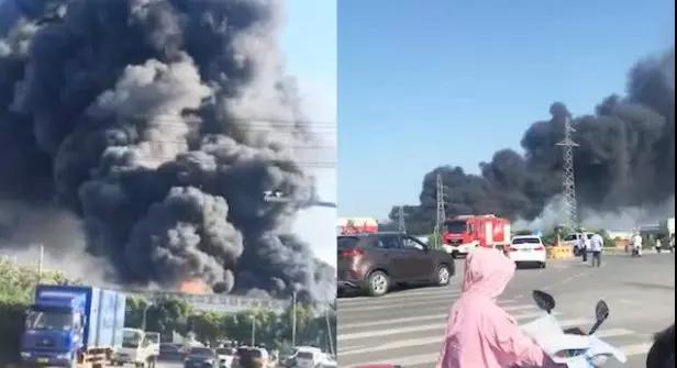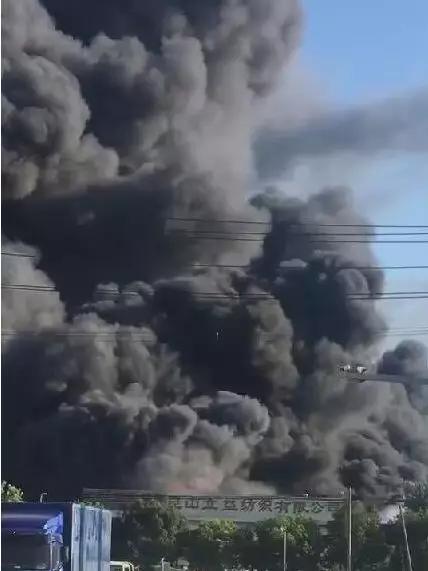 据通讯员提供的现场视频显示,一处写有“昆山立益纺织有限公司”的围墙内,有滚滚浓烟冒出,达10余米高,浓烟中夹杂着明火。事发地点紧邻马路,路上停放在多辆货车,不时有行人在事发地点附近穿梭。