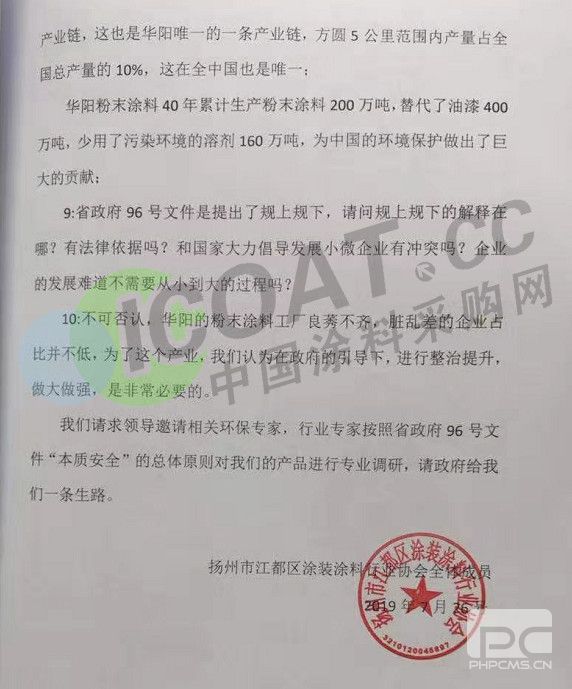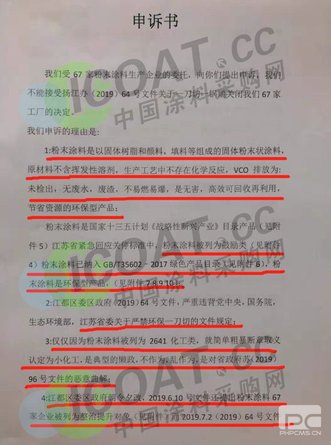 据《申诉书》相关内容显示,扬州市江都区涂装涂料行业协会受67家伟德客户端官网生产企业的委托,不能接受扬江办(2019)64号文件关于一刀切关闭67家工厂的决定,并提出了十条申诉理由,具体内容如下: