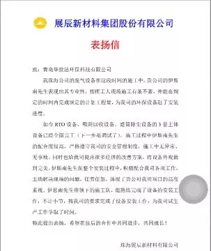 国内建筑涂料龙头企业之一的展辰新材料集团股份有限公司也对华世洁的产品及服务非常满意,并给华世洁发来了表扬信称,在展辰珠海公司的废气设备施工过程中,华世洁的伊斯南先生表现出其专业性,指挥工人现场施工有条不紊,并能在规定的时间内完成制定的计划工程,如今RTO设备、吸附回收设备、滤筒除尘设备的3套主体设备已经全面完工,施工过程中伊斯南先生严格遵守展辰的安全管理制度,施工中无异常,无事故。同时也给展辰提出很多经济的改善方案。