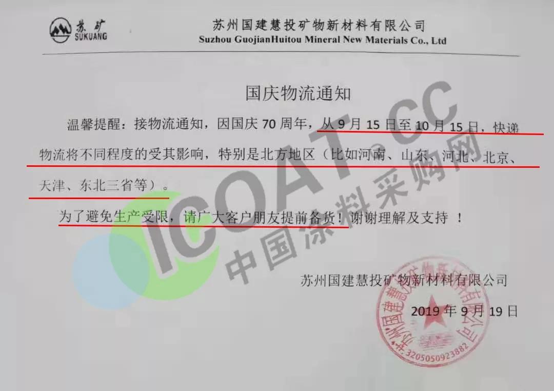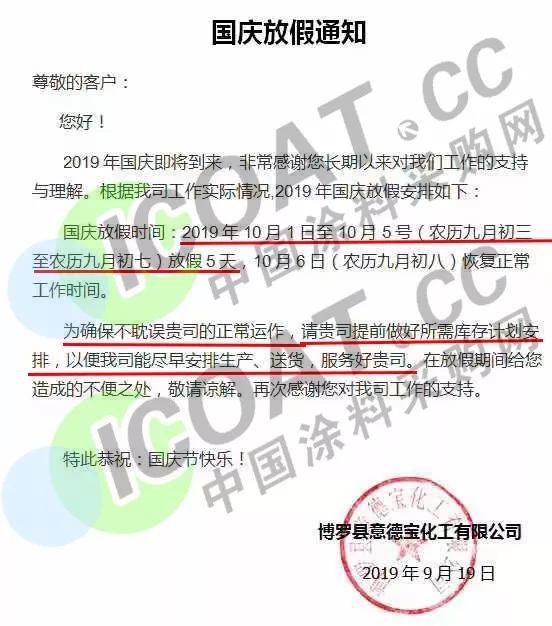 据涂料采购网了解,国庆将至,化工、物流等行业均做好了假期准备。不少化工企业已经部署了假期前后的工作安排并发布通知函,告知客户提前备货,以免受到影响。