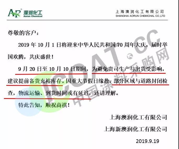 上海澳润化工有限公司发布通知称,9月20日至10月10日期间,为避免贵司生产与出货受影响,建议提前备货充裕库存。因重大节假日缘故,部分区域与道路封闭检查,物流运输、到货时间或有延迟,还请理解。