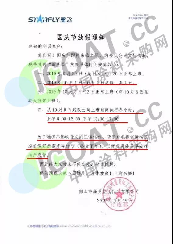 佛山市高明星飞化工有限公司发布通知函称,9月29日,9月30日正常上班,10月1日至10月4日放假共4天,自10月5日起上班时间执行冬令时,上午8:00-12:00,下午13:30-17:30。并提醒客户根据实际情况提前做好所需库存计划(备货下单),以便能够尽早安排。