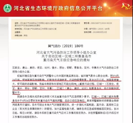 自2019年9月24日0时起发布重污染天气橙色预警并启动Ⅱ级应急响应,预警解除时间另行通知。