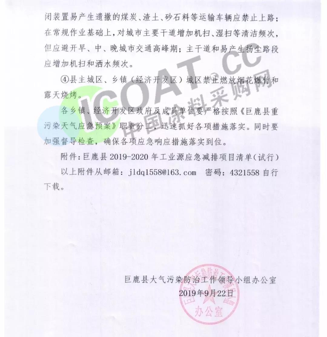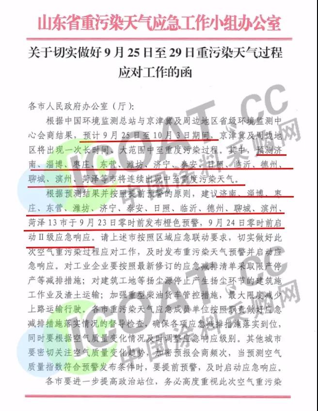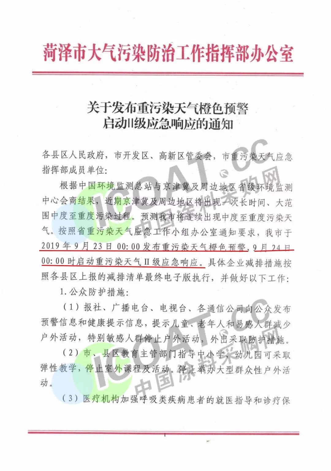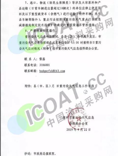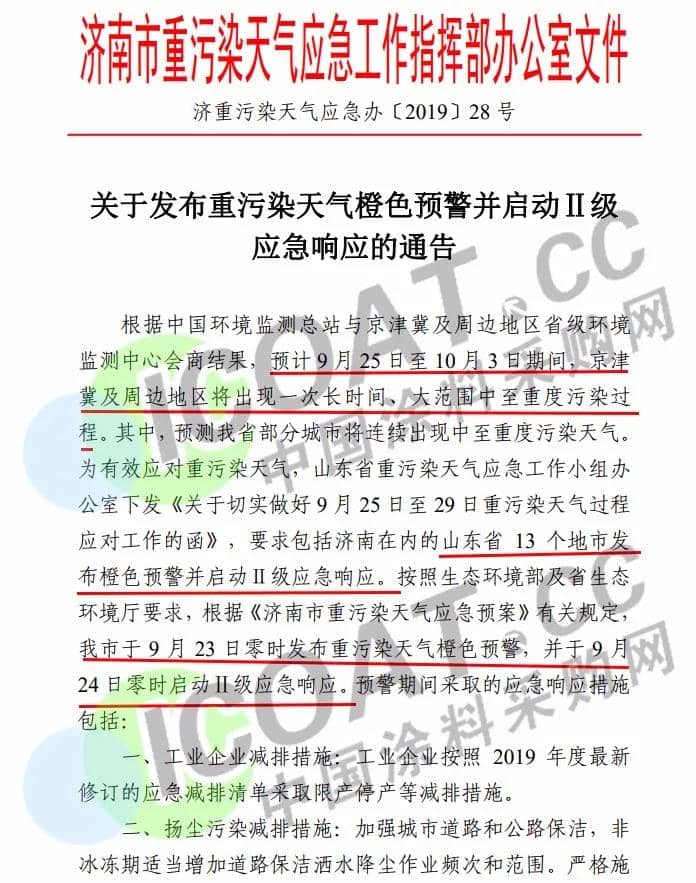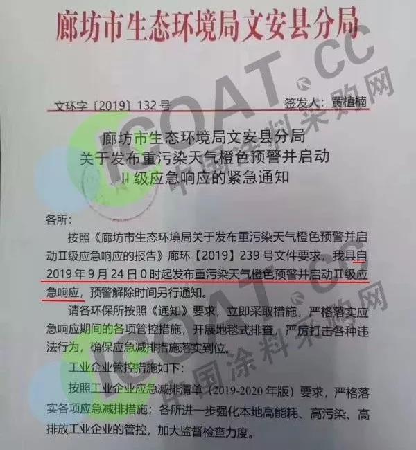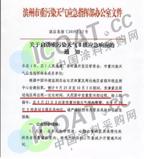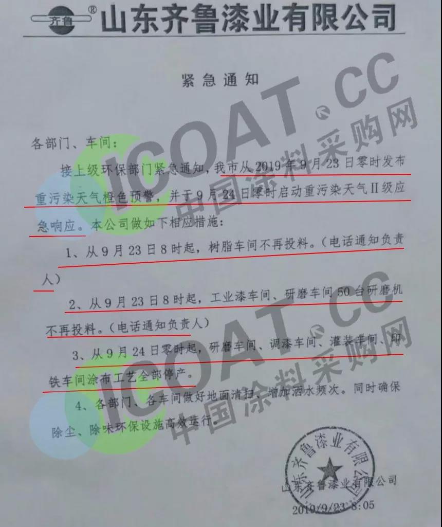 除此之外,山东齐鲁漆业有限公司也发布了紧急通知,称由于本市自2019年9月23日零时发布重污染天气橙色预警,并于9月24日零时启动重污染天气Ⅱ级应急响应,本公司做出如下措施: