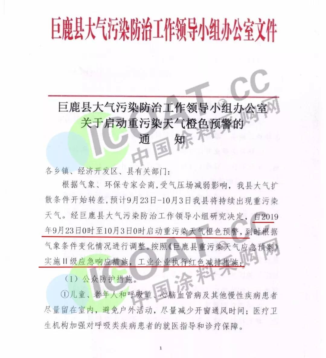 河北邢台启动重污染天气橙色预警 自2019年9月23日0时至10月3日0时启动重污染天气橙色预警,实施Ⅱ级应急响应措施,工业企业执行红色减排措施。除应急抢险外,施工工地应禁止喷涂粉刷、护坡喷浆等。河北邢台巨鹿县启动重污染天气橙色预警,实施II级应急响应 自2019年9月23日0时至10月3日0时启动重污染天气橙色预警,实施II级应急响应措施,工业企业执行红色减排措施。除应急抢险外,施工工地应禁止喷涂粉刷、护坡喷浆等。倡导公众绿色消费,单位和公众尽量减少含挥发性有机物的涂料、油漆、溶剂等原材料及产品的使用。