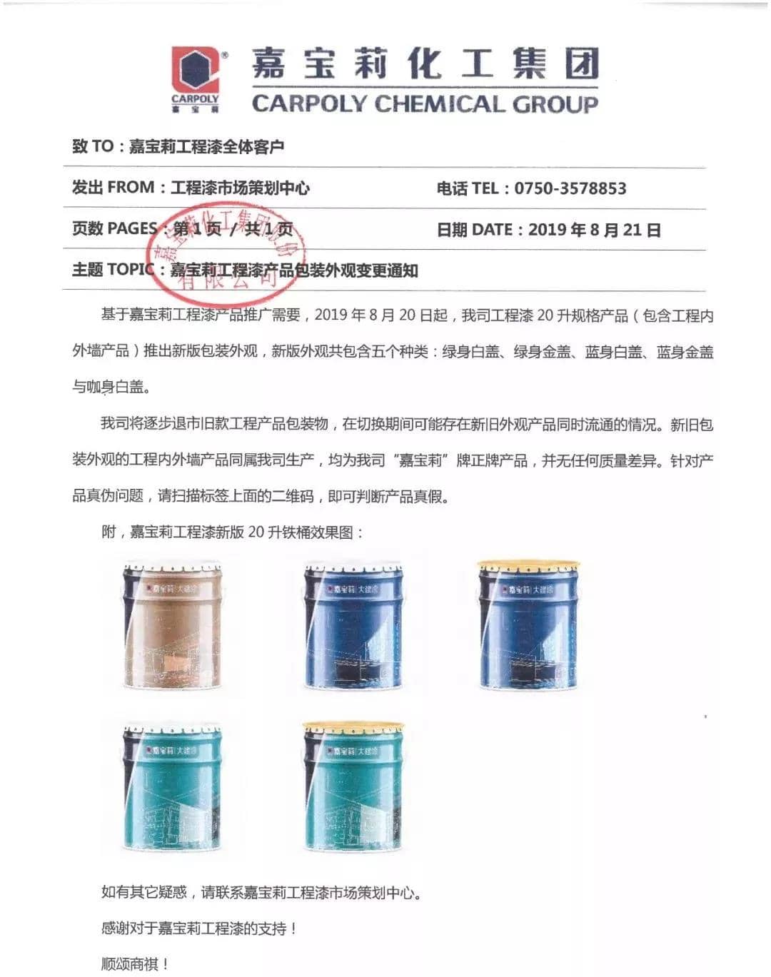 基于嘉宝莉工程漆产品推广需要,2019年8月20日起,嘉宝莉工程漆20升规格产品(包含工程内外墙产品)推出新版包装外观,新版外观共包含五个种类:绿身白盖、绿身金盖、蓝身白盖、蓝身金盖与咖身白盖。 嘉宝莉将逐步退市旧款工程产品包装物,在切换期间可能存在新旧外观产品同时流通的情况。新旧包装外观的工程内外墙产品同属嘉宝莉生产,均为“嘉宝莉”牌正牌产品,并无任何质量差异。针对产品真伪问题,请扫描标签上面的二维码,即可判断产品真假。