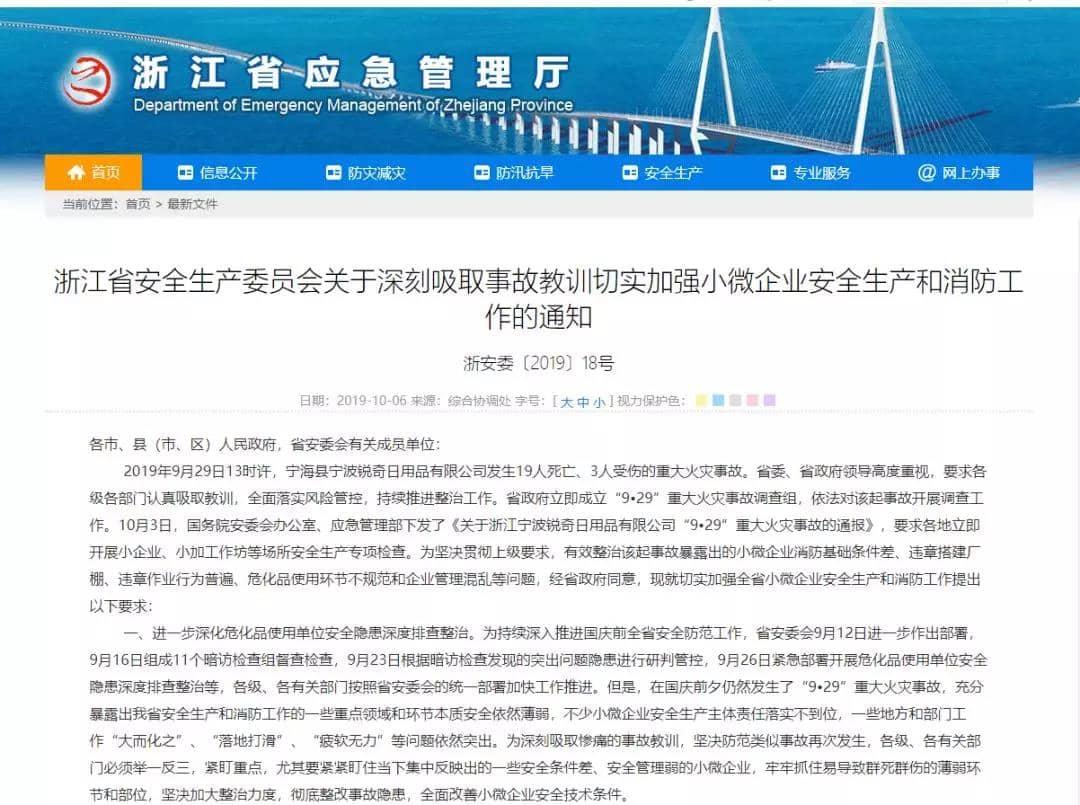 10月6日,浙江省应急管理厅发布了《浙江省安全生产委员会关于深刻吸取事故教训切实加强小微企业安全生产和消防工作的通知》,称省政府立即成立了“9•29”重大火灾事故调查组,对该起事故开展调查工作,并要求各级各部门认真吸取教训,全面落实风险管控,持续推进整治工作。