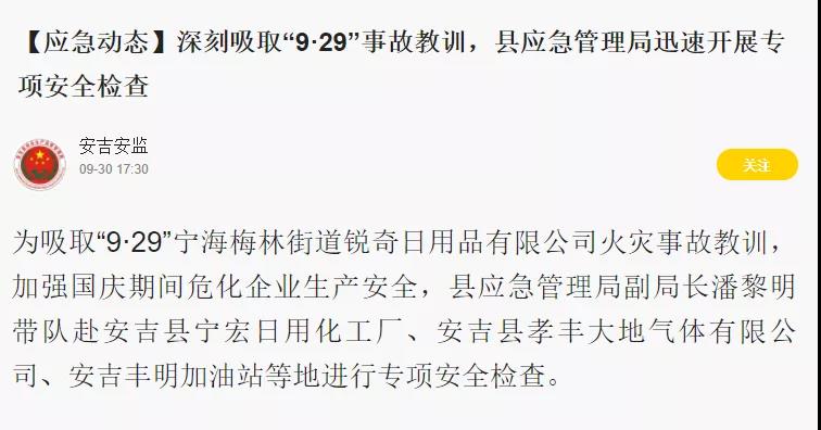 浙江省湖州市安吉县应急管理局深刻吸取“9.29”事故教训,迅速开展了专项安全检查。由县应急管理局副局长亲自带队赴区域内相关企业进行专项安全检查。