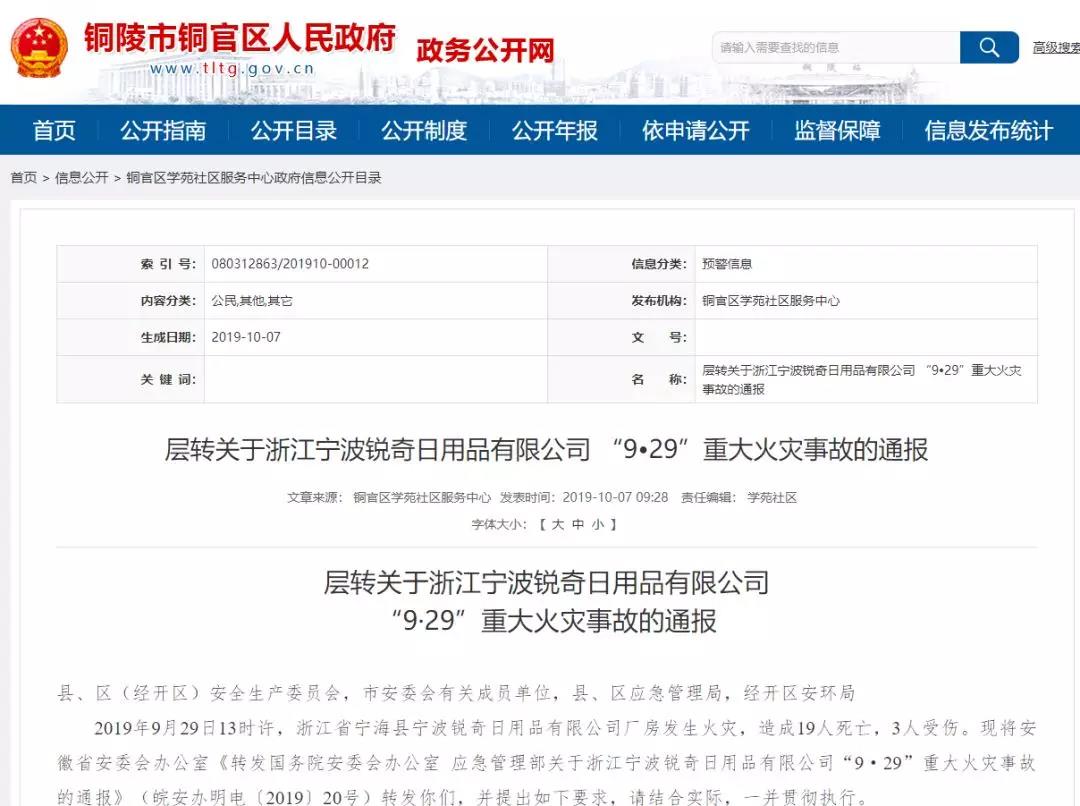 随后,铜陵市、淮安市、邢台市等多地也积极学习了《关于浙江宁波锐奇日用品有限公司“9•29”重大火灾事故》的通报内容,并召开会议,深刻吸取经验教训,坚决杜绝此类事故再次发生。更多的省市地区层转了应急部发布的文件并组织辖区内相关机构部门等进行了学习,浙江、安徽、湖北、河南、内蒙等多区域进行了化工等相关领域的重点专项检查。