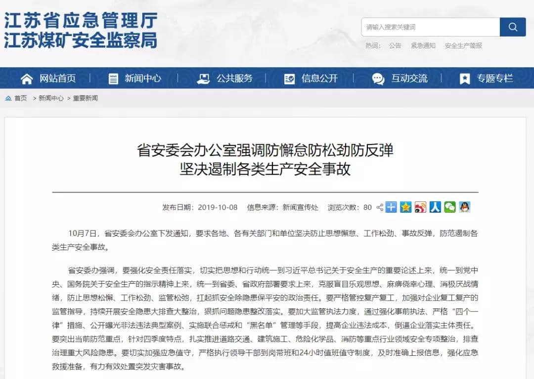 10月7日,江苏省安委会办公室下发通知,要求各地、各有关部门和单位坚决防止思想懈怠、工作松劲、事故反弹,防范遏制各类生产安全事故。