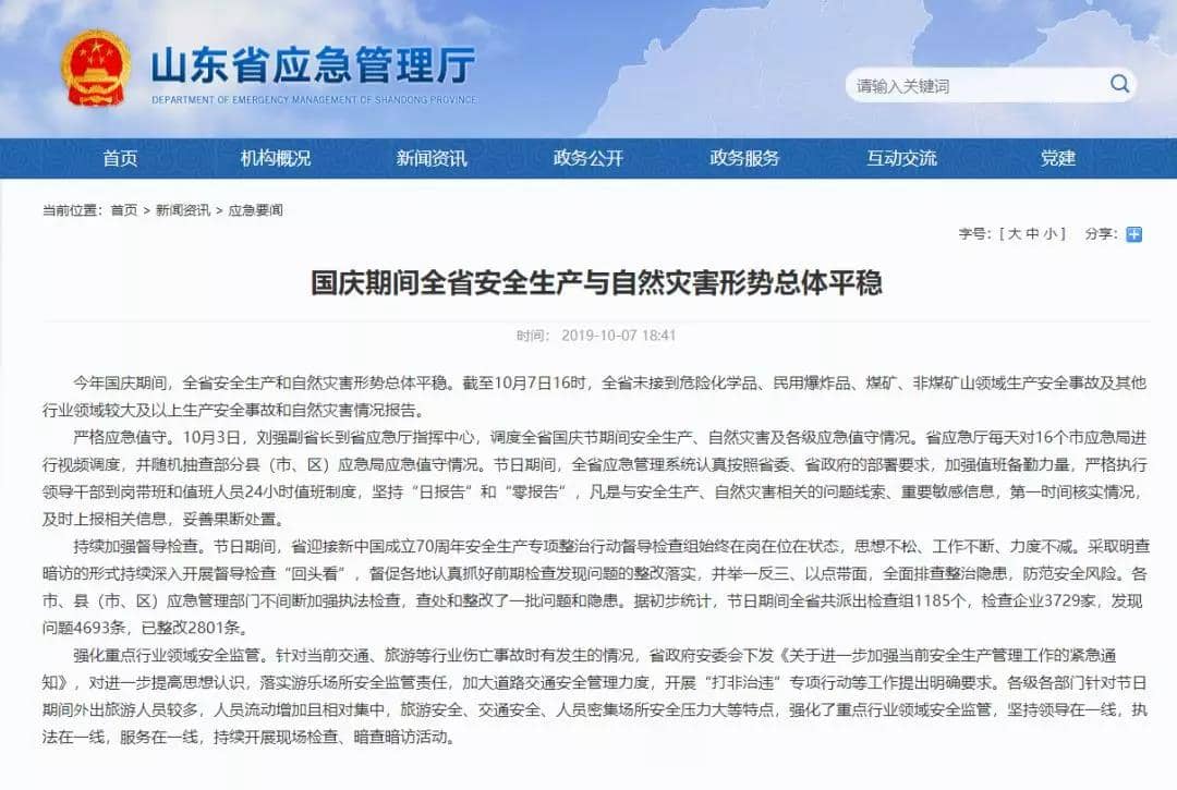 十一期间,山东省应急管理厅采取明查暗访的形式持续深入开展督导检查“回头看”,督促各地认真抓好前期检查发现问题的整改落实,并举一反三、以点带面,全面排查整治隐患,防范安全风险。各市、县(市、区)应急管理部门不间断加强执法检查,查处和整改了一批问题和隐患。据初步统计,节日期间山东全省共派出检查组1185个,检查企业3729家,发现问题4693条,已整改2801条。