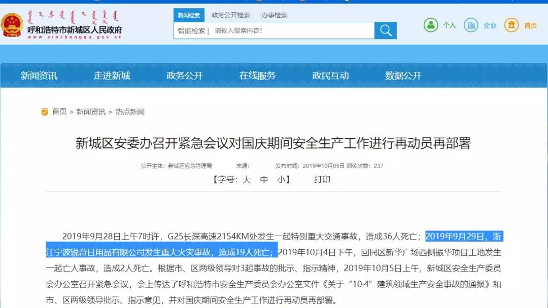 10月5日内蒙古呼和浩特市新城区人民政府转发新城区应急管理部消息称,2019年9月28日上午7时许,G25长深高速2154KM处发生一起特别重大交通事故,造成36人死亡;2019年9月29日,浙江宁波锐奇日用品有限公司发生重大火灾事故,造成19人死亡;2019年10月4日下午,回民区新华广场西侧振华项目工地发生一起亡人事故,造成2人死亡。根据市、区两级领导对3起事故的批示、指示精神,2019年10月5日上午,新城区安全生产委员会办公室召开紧急会议,会上传达了呼和浩特市安全生产委员会办公室文件《关于“10·4”建筑领域生产安全事故的通报》和市、区两级领导批示、指示意见。