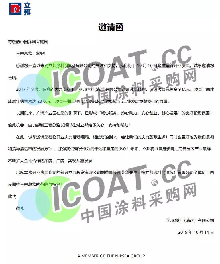 昨日(10月14日),涂料采购网收到立邦涂料的《邀请函》称,10月16日,立邦涂料(清远)有限公司将举行隆重的开业庆典,涂料采购网作为涂料行业最大的新媒体平台,特邀涂料采购网负责人亲临现场,共同见证立邦涂料这一伟大时刻。