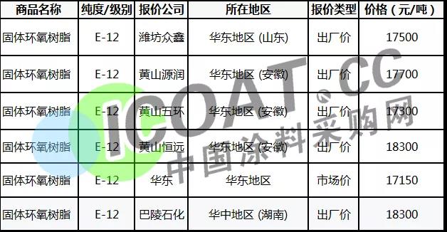 10月17日黄山地区部分环氧树脂企业报价: 黄山市徽州五环化工有限公司固体环氧树脂运往长三角18600元/吨(含票、运费),运往珠三角18800元/吨(含票、运费); 黄山市源润新材料科技有限公司固体环氧树脂运往长三角18000元/吨(含票、运费),运往珠三角18200元/吨(含票、运费); 安徽恒泰新材料科技股份有限公司固体环氧树脂运往长三角18100元/吨(含票、运费),运往珠三角18200元/吨(含票、运费); 黄山天马新材料科技有限公司固体环氧树脂运往长三角17800元/吨-18000元/吨(含票、运费),运往珠三角18000元/吨~18200(含票、运费); 黄山锦峰实业有限公司固体环氧树脂运往长三角18000元/吨(带票含运费),运往珠三角18200元/吨(含票、运费); 歙县友谊化工有限责任公司固体环氧树脂运往长三角、珠三角17800元/吨-18000元/吨(带票含运费);