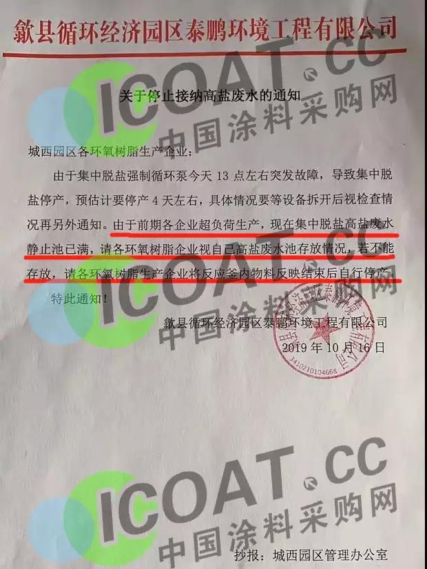 另外,据涂料采购网了解,歙县循环经济园区发布了《关于停止接纳高盐废水的通知》,通知中提到因为园区内,由于集中脱盐强制循环泵13点突发故障,导致集中脱盐停产,预估计要停产4天。通知提到,由于之前各大企业的超负荷生产,导致集中脱盐高盐废水静止池已满,所以要求各环氧树脂生产企业将反应釜内物料反应结束后自行停产。