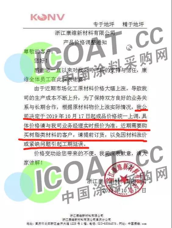 据涂料采购网了解,目前已有下游用户发布涨价通知称:根据原材料物价上涨实际情况,浙江康维新材料有限公司决定于2019年10月17日起成品价格统一上调。近期需要购买树脂类材料的客户,请提前订货,以免因材料涨价或紧缺问题引起工期延误。