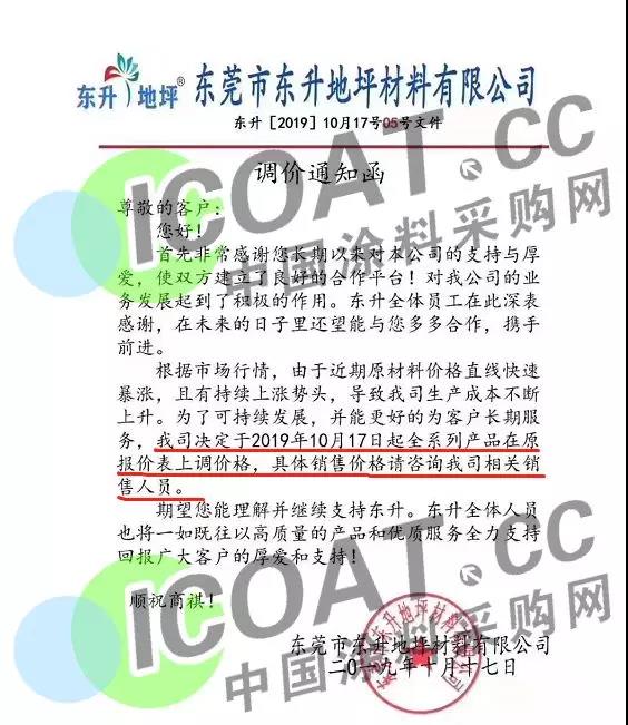 10月17日,东莞市东升地坪材料有限公司也发布涨价通知称,由于近期原材料价格直线快速暴涨,且有持续上涨势头,导致东升地坪材料生产成本不断上,因此,东升地坪材料决定自2019年10月17日起全系列产品在原报价表基础上调价格。