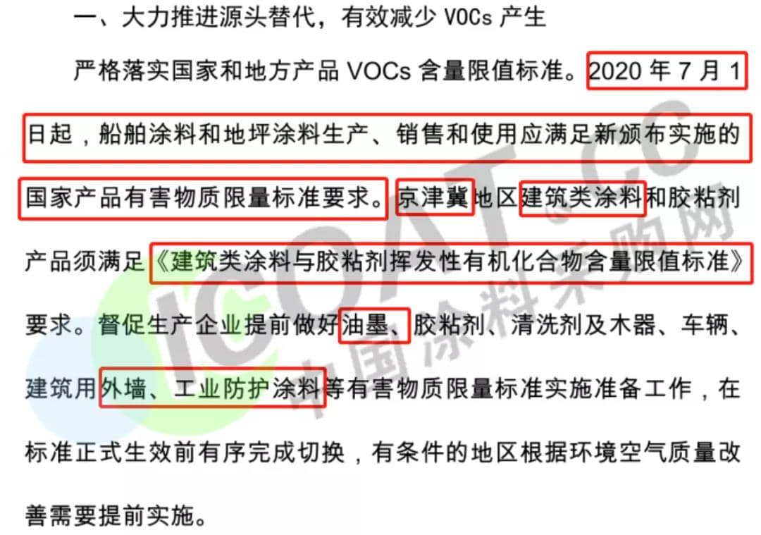 2020年7月1日起,船舶涂料和地坪涂料生产、销售和使用应满足新颁布实施的国家产品有害物质限量标准要求。京津冀地区建筑类涂料和胶粘剂产品须满足《建筑类涂料与胶粘剂挥发性有机化合物含量限值标准》要求。督促生产企业提前做好油墨、胶粘剂、清洗剂及木器、车辆、建筑用外墙、工业防护涂料等有害物质限量标准实施准备工作,在标准正式生效前有序完成切换,有条件的地区根据环境空气质量改善需要提前实施。