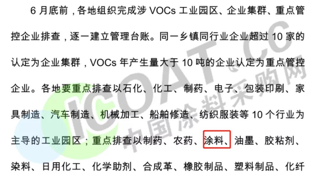 6月底前,各地组织完成涉VOCs工业园区、企业集群、重点管控企业排查,逐一建立管理台账。重点排查以制药、农药、涂料、油墨、胶粘剂、染料、日用化工、化学助剂、合成革、橡胶制品、塑料制品、化纤生产、有机化学原料制造等化工行业,使用溶剂型涂料、油墨、胶粘剂和其他有机溶剂的家具、零部件制造、钢结构、铝型材、铸造、金属表面处理、电线电缆制造、彩涂板、工业涂布、电子元器件、汽修、包装印刷、人造板、皮革制品、制鞋等行业,以及纺织印染、注塑等30个行业为主导的企业集群。