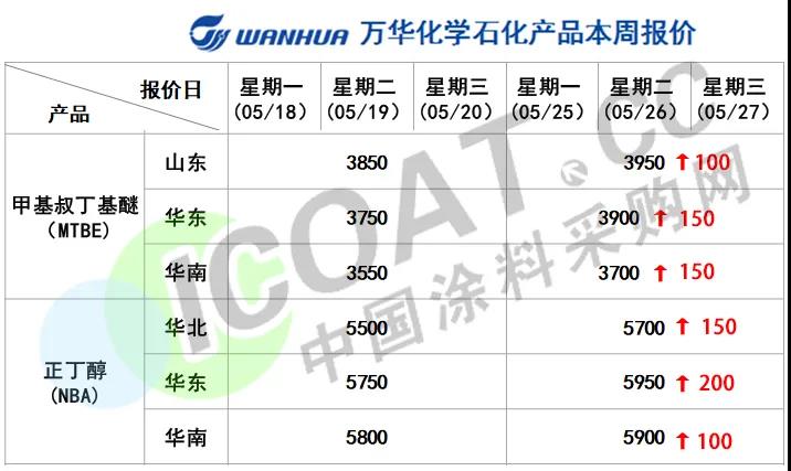 万华化学5月25日报价,甲基叔丁基醚山东地区上涨100元/吨至3900元/吨,华东、华南区域上涨150元/吨分别至3900元/吨,3700元/吨。正丁醇华北区域上涨150元/吨至5700元/吨,华东区域上涨200元/吨至5950元/吨,华南地区上涨100元/吨至5900元/吨。