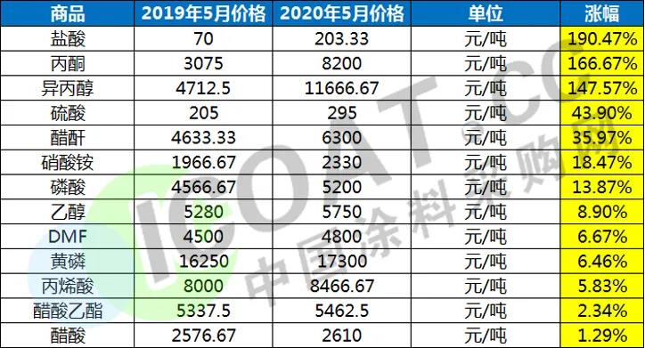 相较2019年5月同期数据,共有13种化工原材料价格出现涨势,其中排名前三位的是盐酸(190.47%),丙酮(166.67%),异丙醇(147.57%)。盐酸的价格由去年5月的70元/吨飙升至今年5月的203.33元/吨,涨幅几近翻倍。业内人士分析,根据以往情况来说,TDI、氯丙烯,环氧丙烷及甲烷氯化物所联产副产盐酸质量相对较好,副产酸对于盐酸市场的冲击较大。但就今年的情况来看,众多化工原材料下游需求端出现停滞,因此副产酸市场也受到了影响,盐酸也就得到了利好。