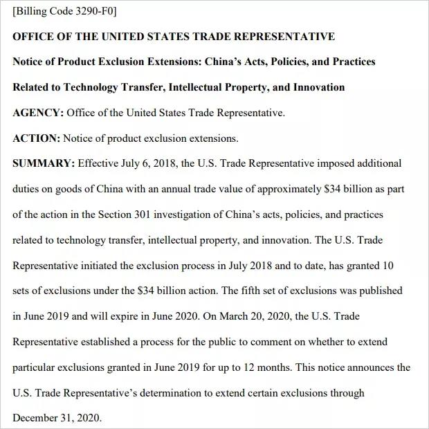 无论美国进口商是否提交过排除请求,符合本次通知说明的产品都可以获得排除有效期延长至2020年12月31日。