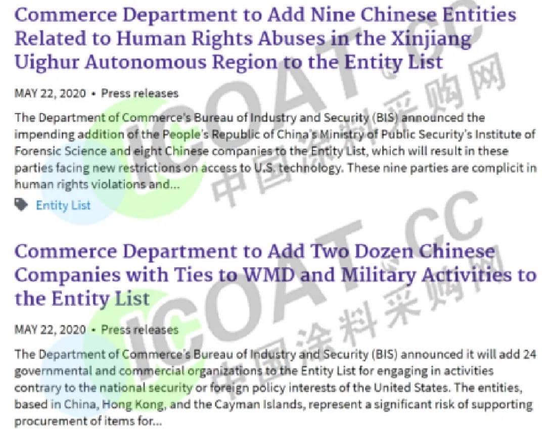 据涂料采购网了解,5月22日,美国商务部产业安全局(BIS)宣布,分两批将33个中国实体加入“实体清单”(Entity List),理由为包括人权、采购相关物项用于中国的军事最终用途的风险等,涉及国内著名的科技公司、大学和科研机构,被列入实体清单的,未来向以上实体出口、再出口、境内转让受《出口管理条例》(EAR)管辖的物项需要事先取得BIS的出口许可,这意味着这些企业将无法与美国进行任何商业交易。