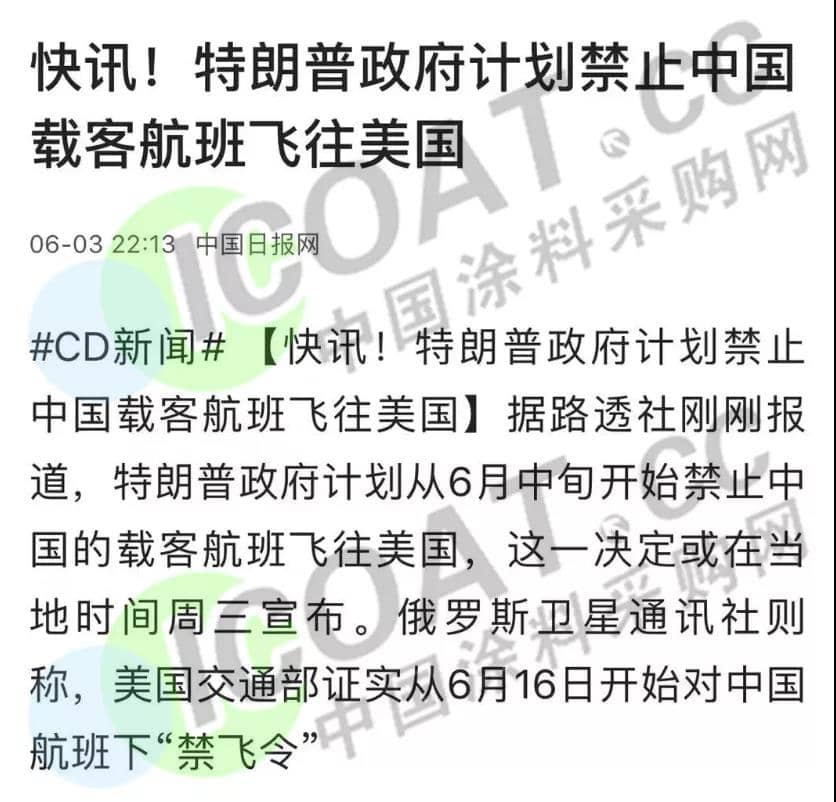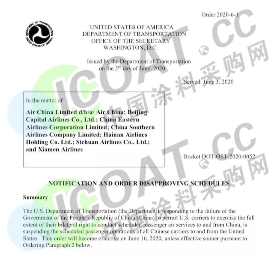 同日,美国交通部对中国航班下“禁飞令”,宣布将从本月16日起暂停所有中国航空公司执飞的中美定期客运航班,涉及中国国际航空、首都航空、东方航空、南方航空、海南航空、厦门航空等多家航空公司。