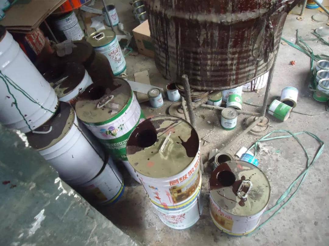 执法人员前往现场检查,发现一套用于生产加工涂料的简易设备,以及大量涂料生产原料、外包装贴纸,车间角落随意堆放着近200桶贴有“墙瑞”“沪宇”“紫金花”“斯普兰”等11个品牌商标的成品涂料。
