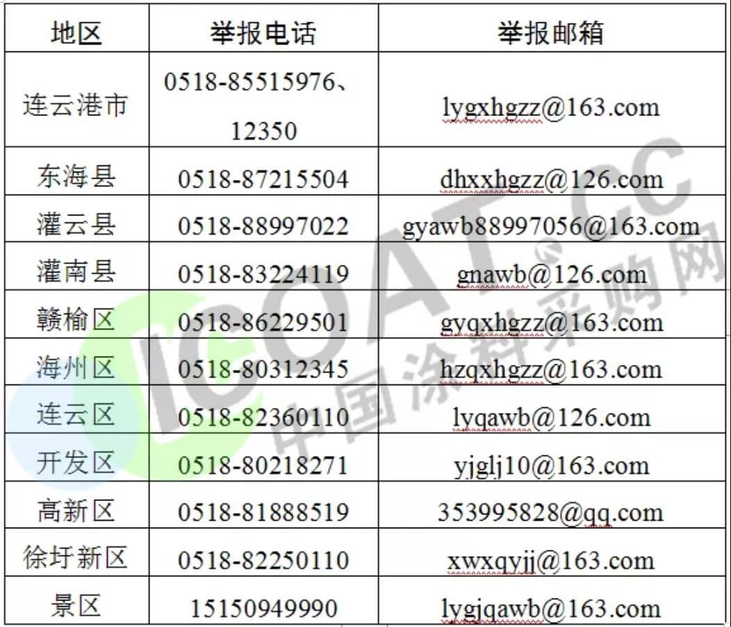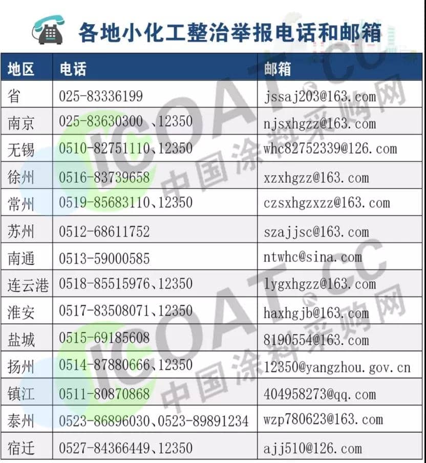 除了各地区各部门对违法违规“小化工”彻底排查外,江苏省安委会办公室还于6月2日向社会公布了违法违规百日“小化工”专项整治行动省及各设区市举报方式,要求强化社会监督,欢迎广大群众对身边的违法违规化工生产、经营、储存的企业、单位和个人及相关场所予以举报,对举报信息核查属实的个人或单位将根据有关规定给予2至10万元的奖励。附各个地区举报电话: