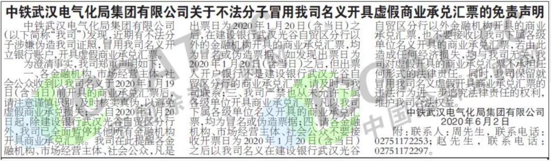 请相关金融机构,市场经营主体及社会公众不要接受开票日期为1月20日(含当日)之后以其名义在建设银行武汉光谷自贸区分行以外金融机构开具的商业承兑汇票 ,也不要接受其公司下属各级单位名义开具的商业承兑汇票 。